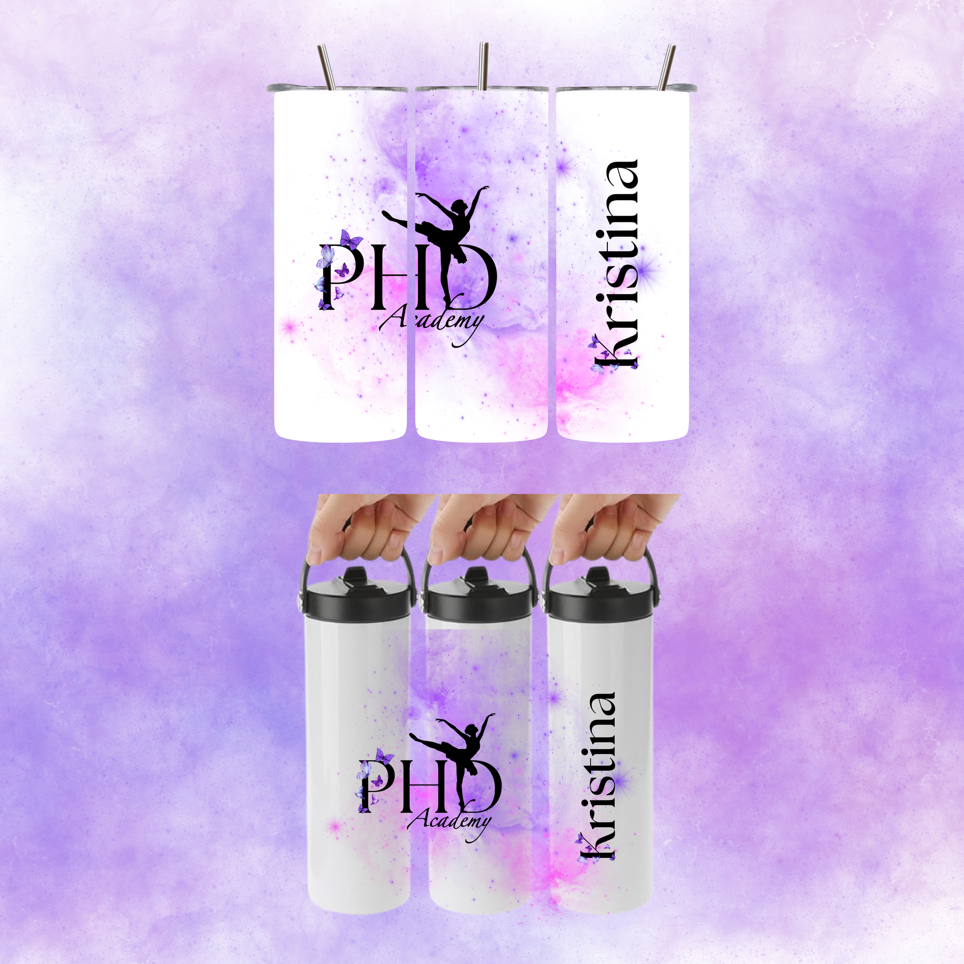 Show off your PHD Academy spirit in style with our custom 20 oz tumblers! Each tumbler features a soft pink and purple splash background with your name printed vertically for a personalized touch. Choose your favorite logo and lid style perfect for dancers, parents, and supporters alike!