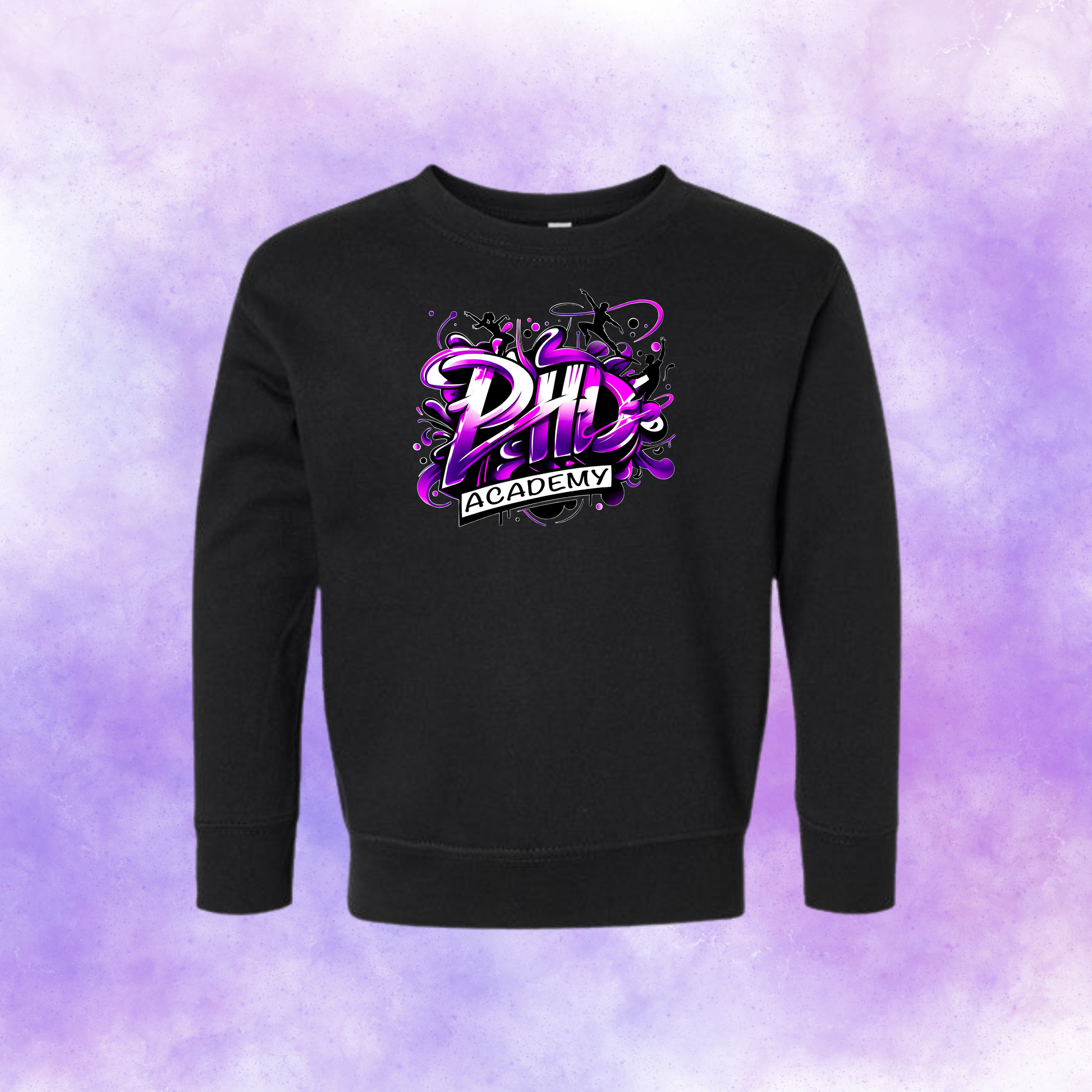 Keep your little dancer warm and stylish while showing off their PHD Academy pride! These toddler crewneck sweatshirts are soft, cozy, and perfect for rehearsals, competitions, or everyday wear.